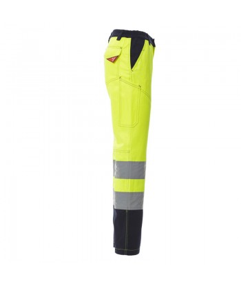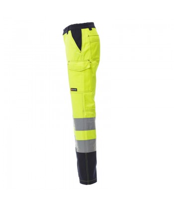Pantalon pour femme, multi-saison, haute visibilité avec passepoils réfléchissants, élastiques latéraux et passants à la taille, fermeture éclair et bouton en plastique de fermeture, deux poches de coupe classique sur le devant, poche latérale LOCK SYSTEM, porte-mètre, deux poches arrière dont une ouverte et une à rabat et velcro. Coutures en contraste, entrejambe et intérieur jambe à triple aiguille.