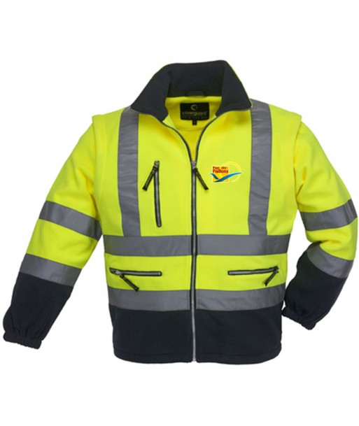 Matière Extérieure > softshell (94% polyester, 6% spandex) déperlant et respirant collé sur 100% polyester micro polaire 310 G/m2. Doublure > tricot 100% polyester Imperméabilité > 8000 mm Respirabilité > 3000 mvp Bandes > rétroréfléchissantes (2 ceintures, 2 bretelles dos et devant, 2 brassards par manche) Fermeture > glissière lisse jusqu’en haut du col Col > droit avec capuche intégrée Manches amovibles > terminées par poignets réglables par bandes agrippantes Serrage bas > élastique avec bloque-cordons intérieurs sur côtés Protège-reins Poches > 2 poches basses, fermeture à glissière lisse verticale, 1 poche haute, fermeture à glissière lisse verticale.