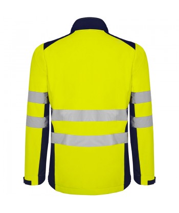 Soft shel bi-couleur haute visibilité, résistant à l´eau, tissu interieur doux avec une grande capacité de chaleur. · Deux bande reflechissantes sur la poitrine et manches · Col montant, fermeture centrale invertie · Poignets ajustables avec velcro. · Ceinture avec gomme élastique et curseur pour ajustement. · Trois poches exterieur.